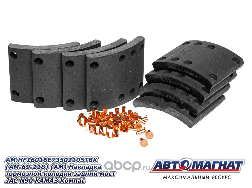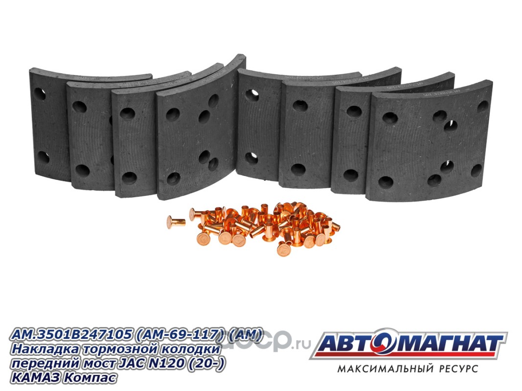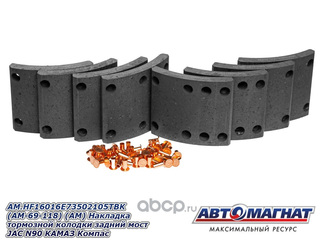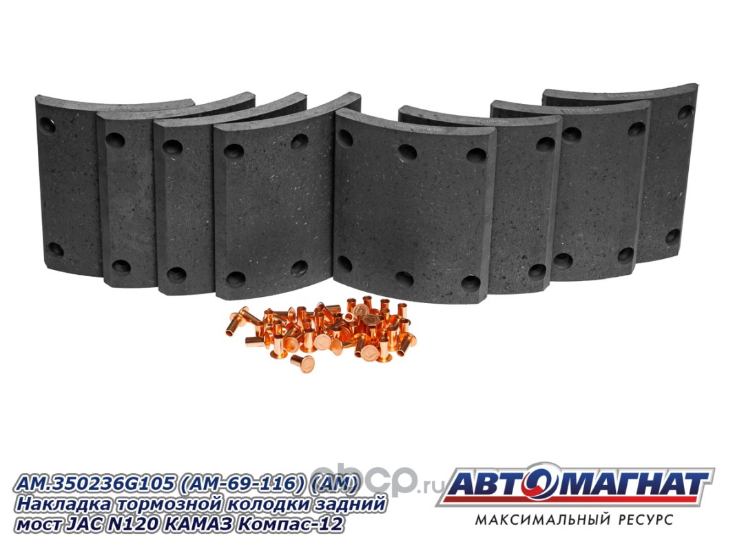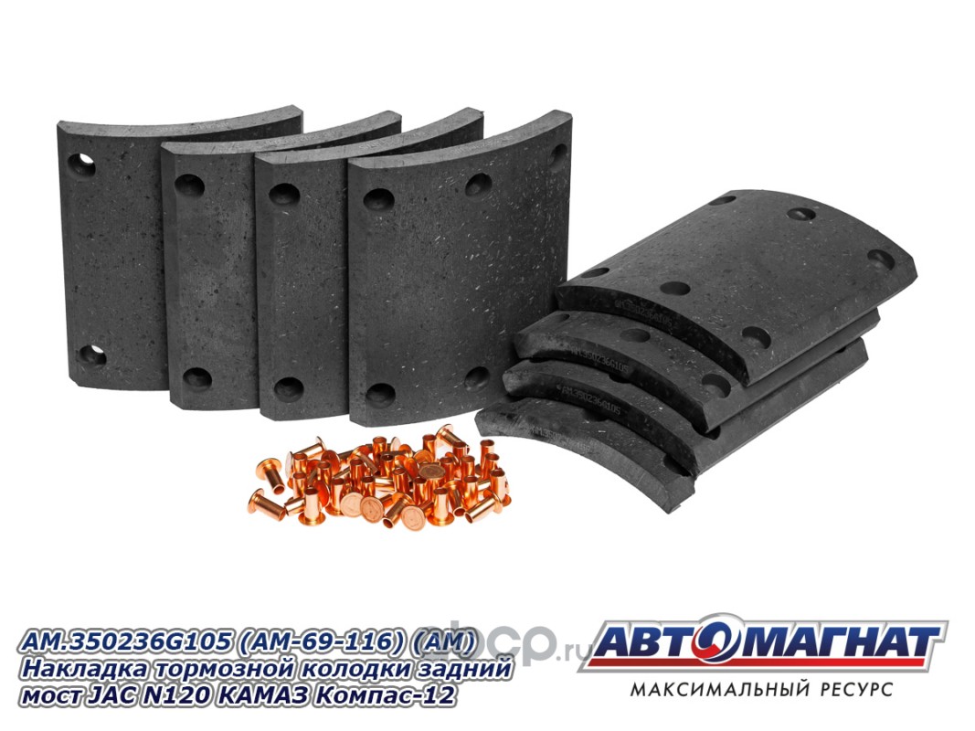 Накладка тормозной колодки задний мост JAC N120 (20-), КАМАЗ Компас-12, сверленые комплект 8шт. с заклепками