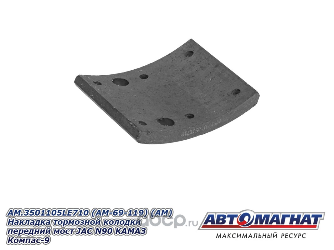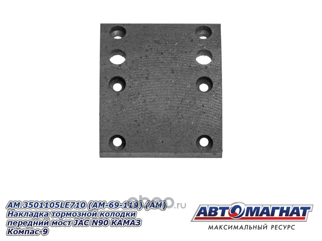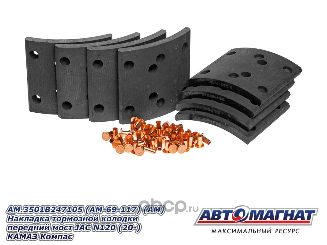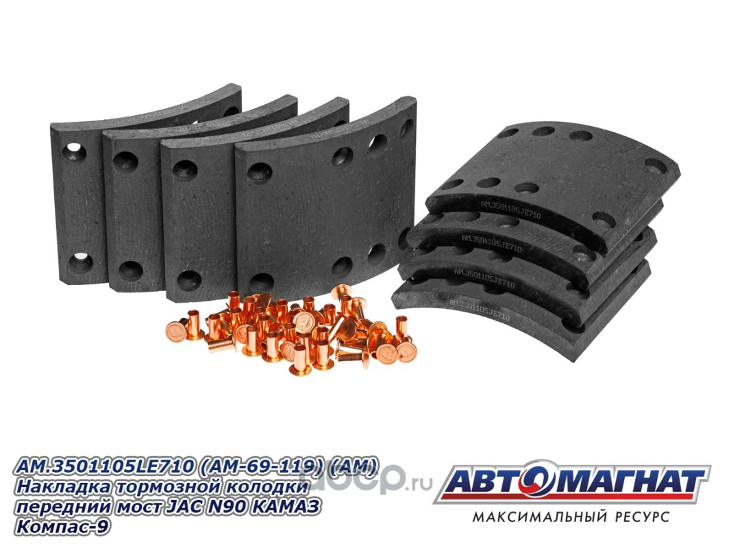 Накладка тормозной колодки передний мост JAC N90 КАМАЗ Компас-9, сверленые комплект 8шт. с заклепками