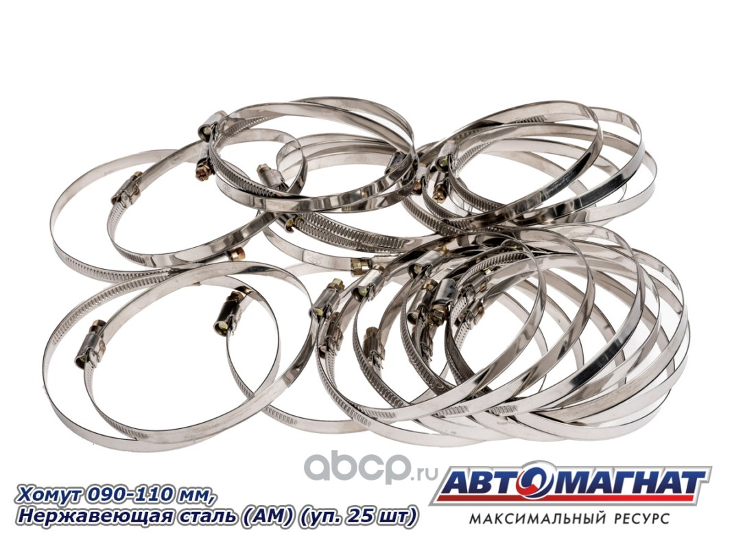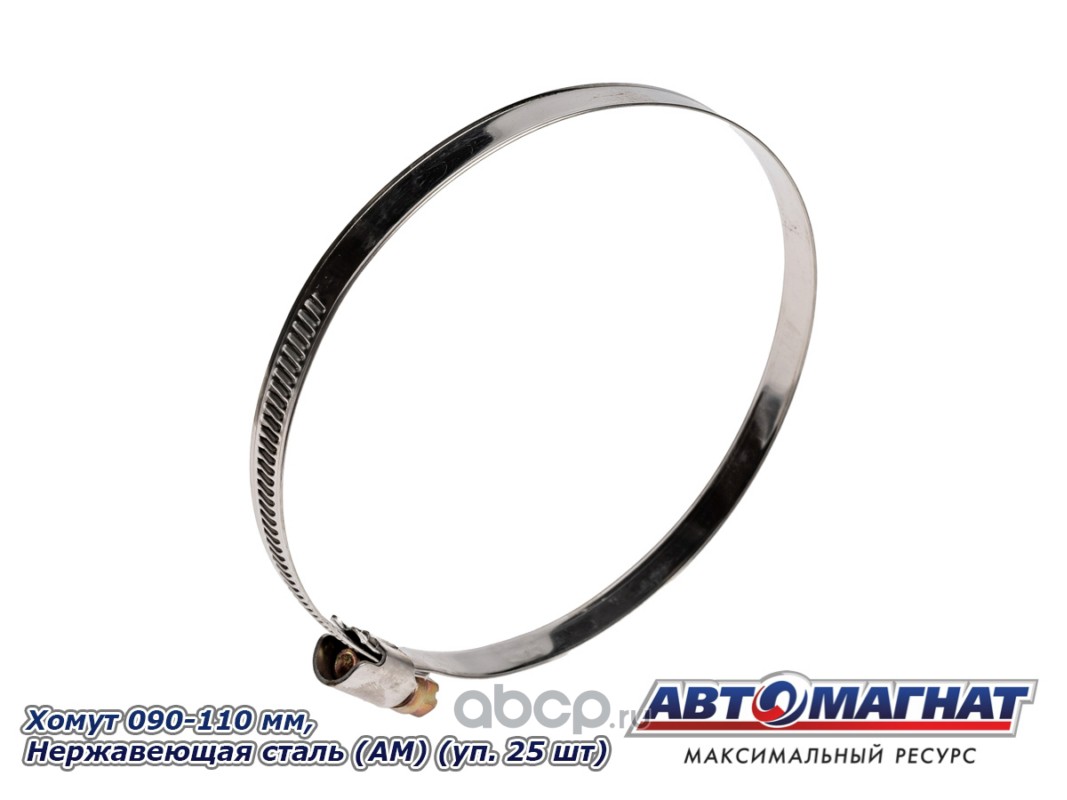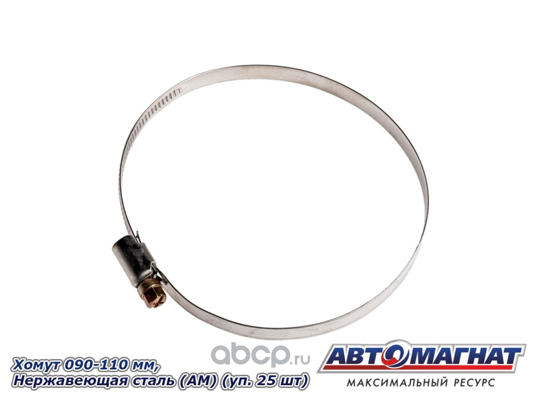 Хомут ленточный 090-110 мм, ширина 9 мм, W2-Нержавеющая сталь, болтовое крепление "Автомагнат", (уп.25 шт)