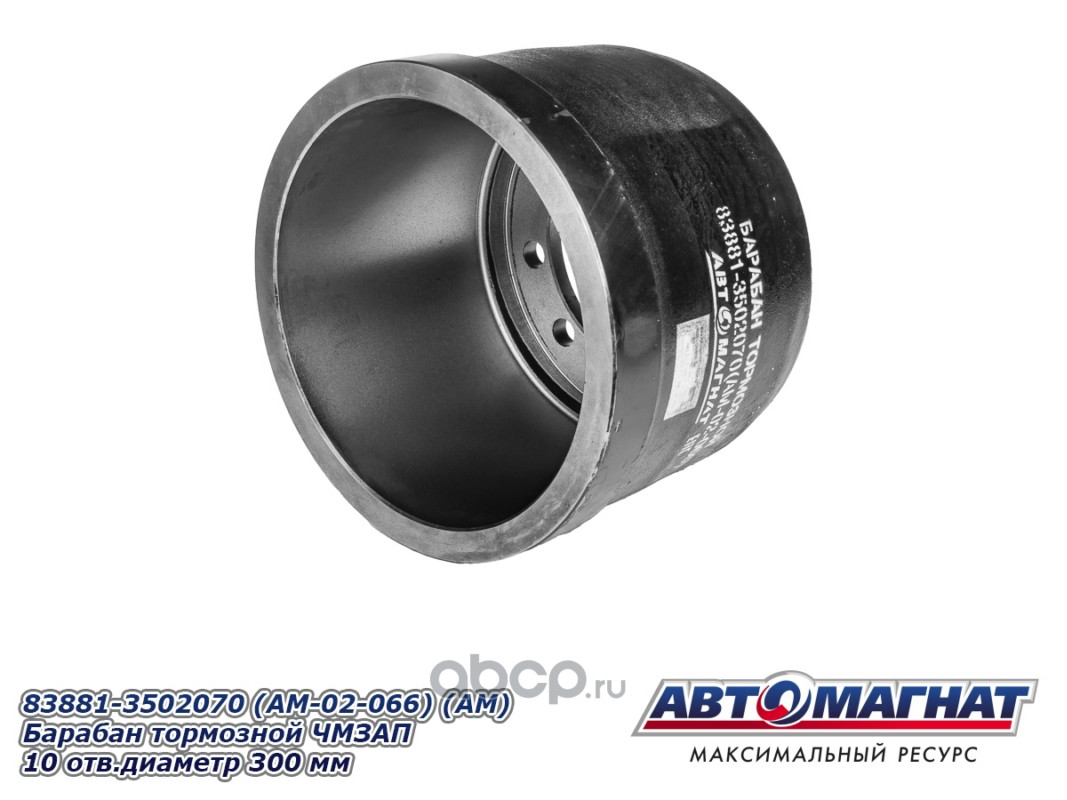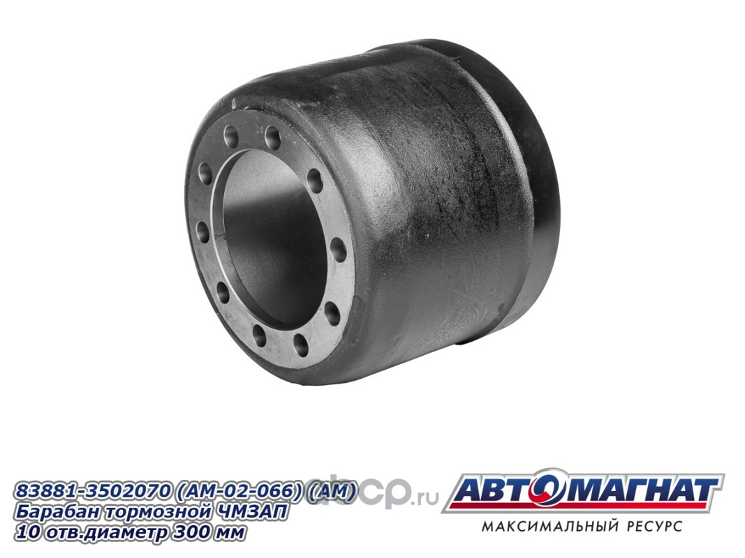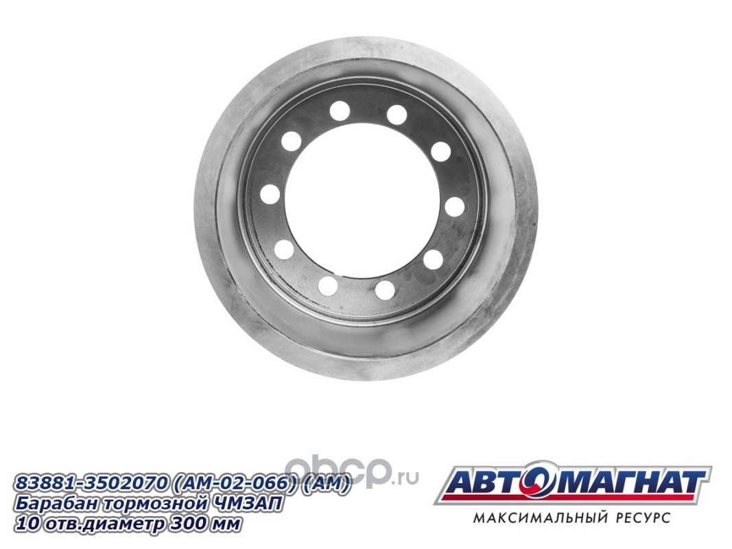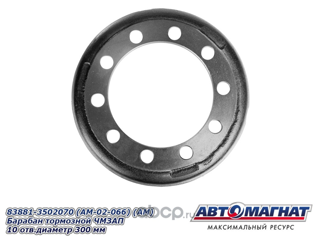 Барабан тормозной ЧМЗАП 83881-3502070 (10 отверстий, диаметр 300 мм), устанавливается на ЧМЗАП 99064, ЧМЗАП 93853, ЧМЗАП 99065 (юмба), ЧМЗАП 93262 на шине 8.25R15, 235/75R17.5