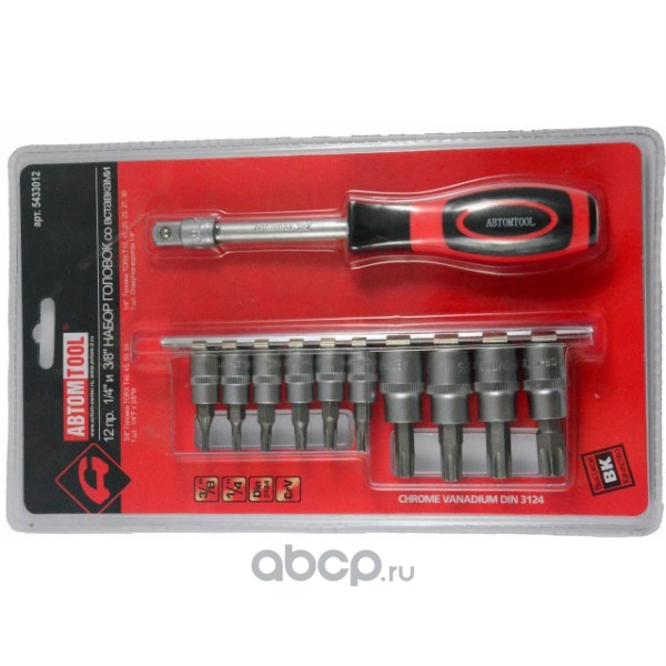 | АВТОМ TOOL | 5433012 | Набор вставок (бит) 1/4"+3/8" 12 предметов Т10-Т55+отверка+адаптер (на планке)АВТОМTOOL, РROFFI, CrV | ||