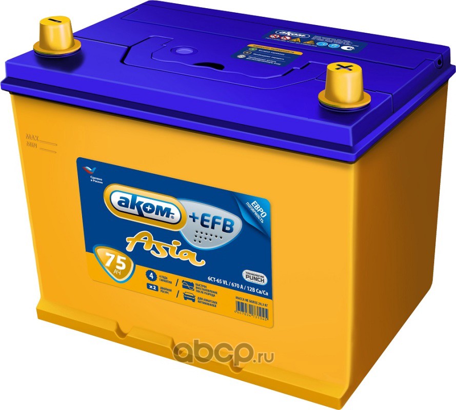 | АКОМ | 6СТ651EFB | Батарея аккумуляторная 65А/ч 650А прямая полярн. стандартные (Европа) клеммы | ||
