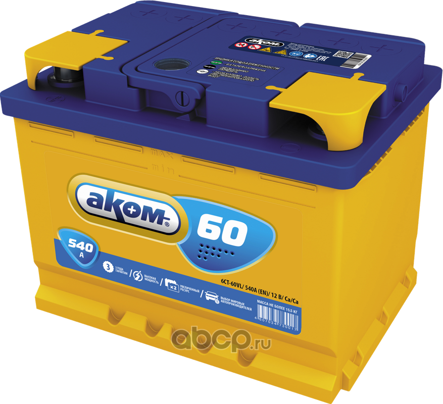 | АКОМ | 4607034731205 | Батарея аккумуляторная 60А/ч 480А прямая полярн. стандартные (Европа) клеммы | ||