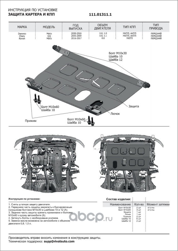 Защита картера и КПП Chery, Daewoo, Ravon Sweet (QQ), Matiz крепеж в комплекте сталь 1.5 мм черный АвтоБроня