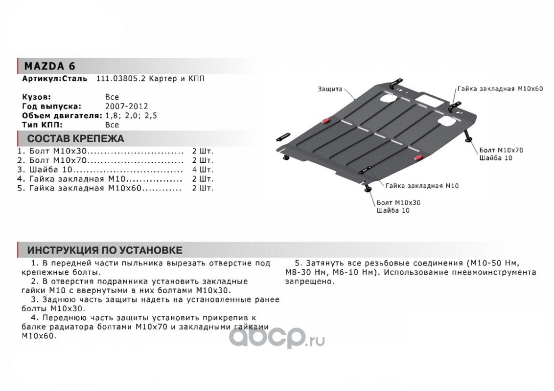 Защита картера и КПП Mazda 6 крепеж в комплекте сталь 1.8 мм черный АвтоБроня
