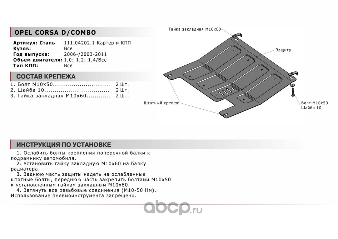 Защита картера + КПП + крепеж АвтоБРОНЯ, Сталь, Opel Combo 2003-2011/Opel Corsa 2006-2015 Rival