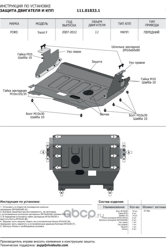 Защита картера и КПП Ford Transit крепеж в комплекте сталь 1.8 мм черный АвтоБроня