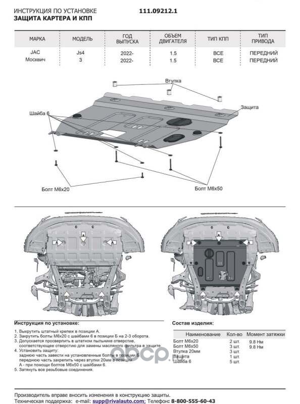 Защита картера и КПП + комплект крепежа, АвтоБроня, Сталь, JAC JS4 2022-, V-1,5, Москвич 3 2022-, V