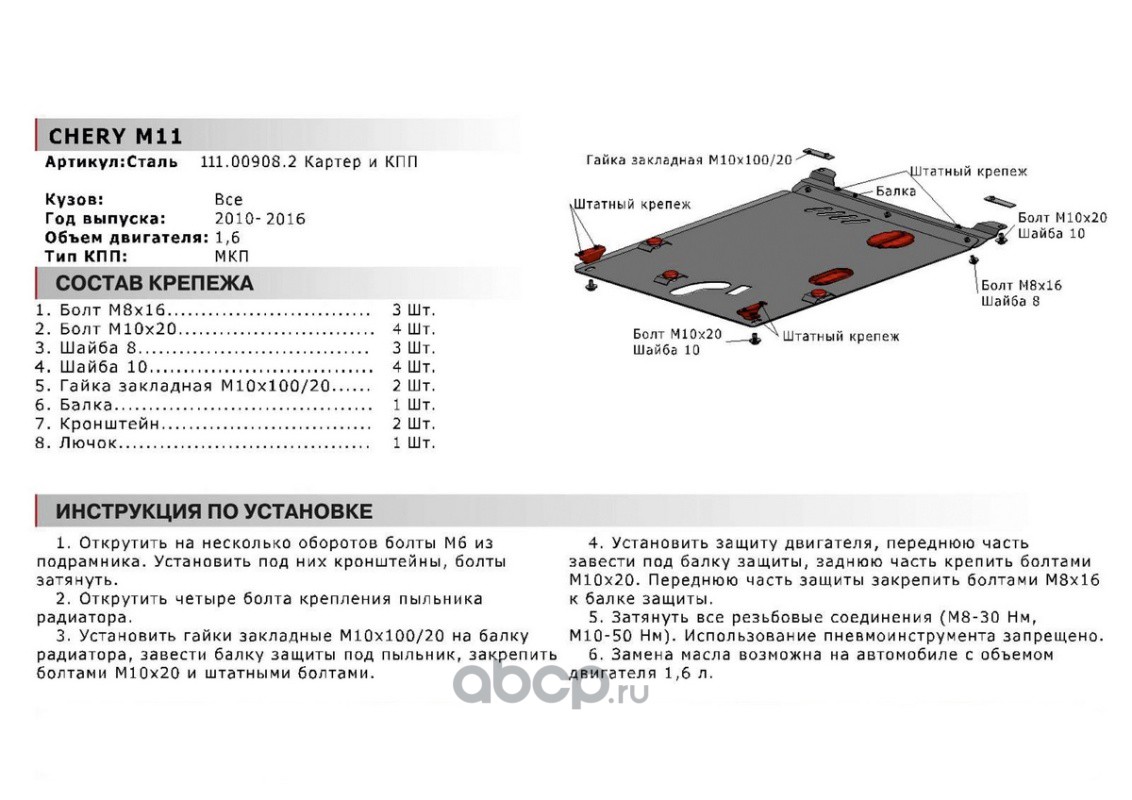 | Автоброня | 111009082 | ЗК+КПП Chery M11 (A3) 2010-2015, st 1.8mm | ||