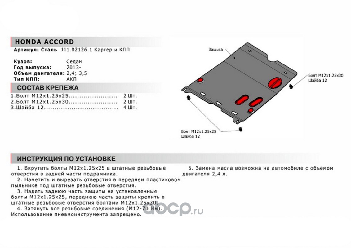 | Автоброня | 111021261 | ЗК+КПП Honda Accord IX 2012-2015, st 1.8mm | ||