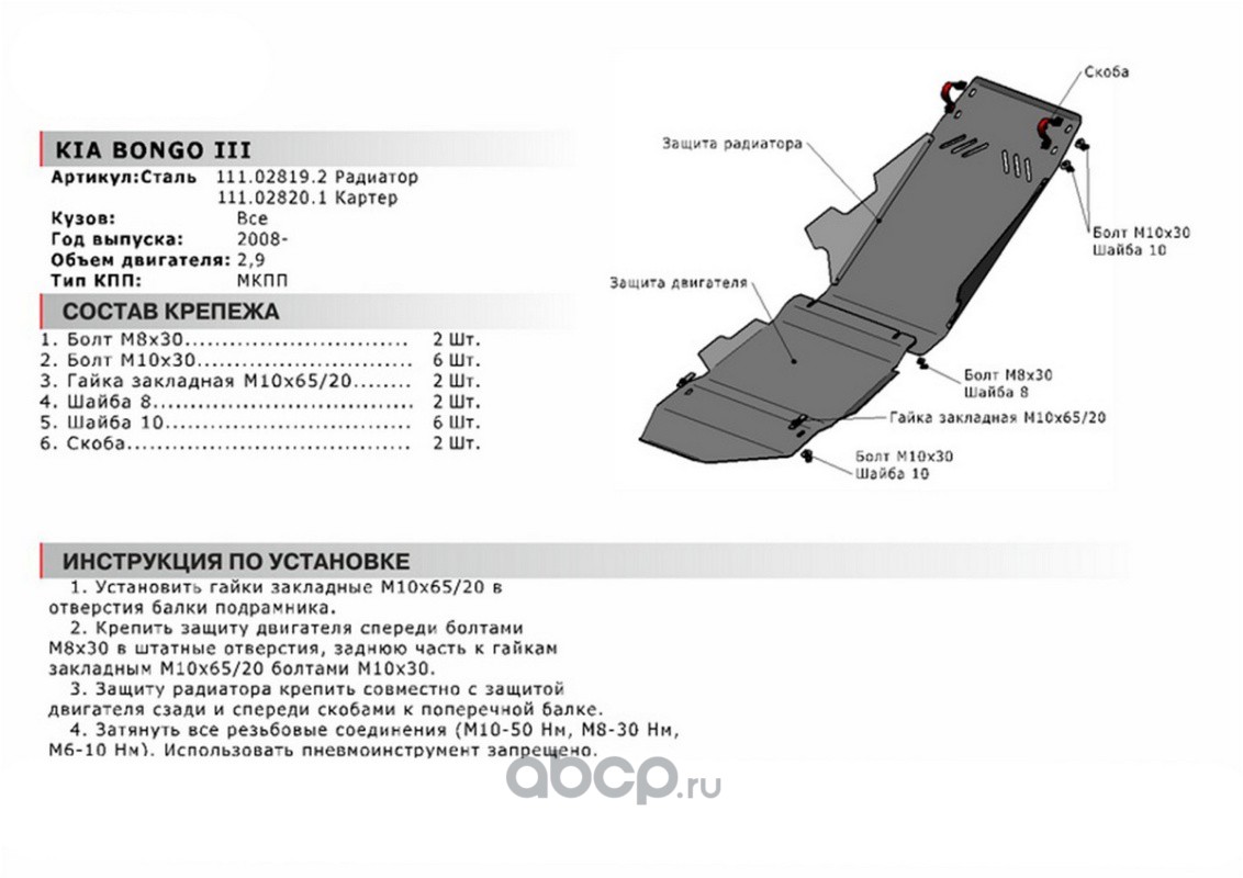 | Автоброня | 111028201 | Защита картера Kia Bongo 4WD 08-12, 111.02820.1 | ||