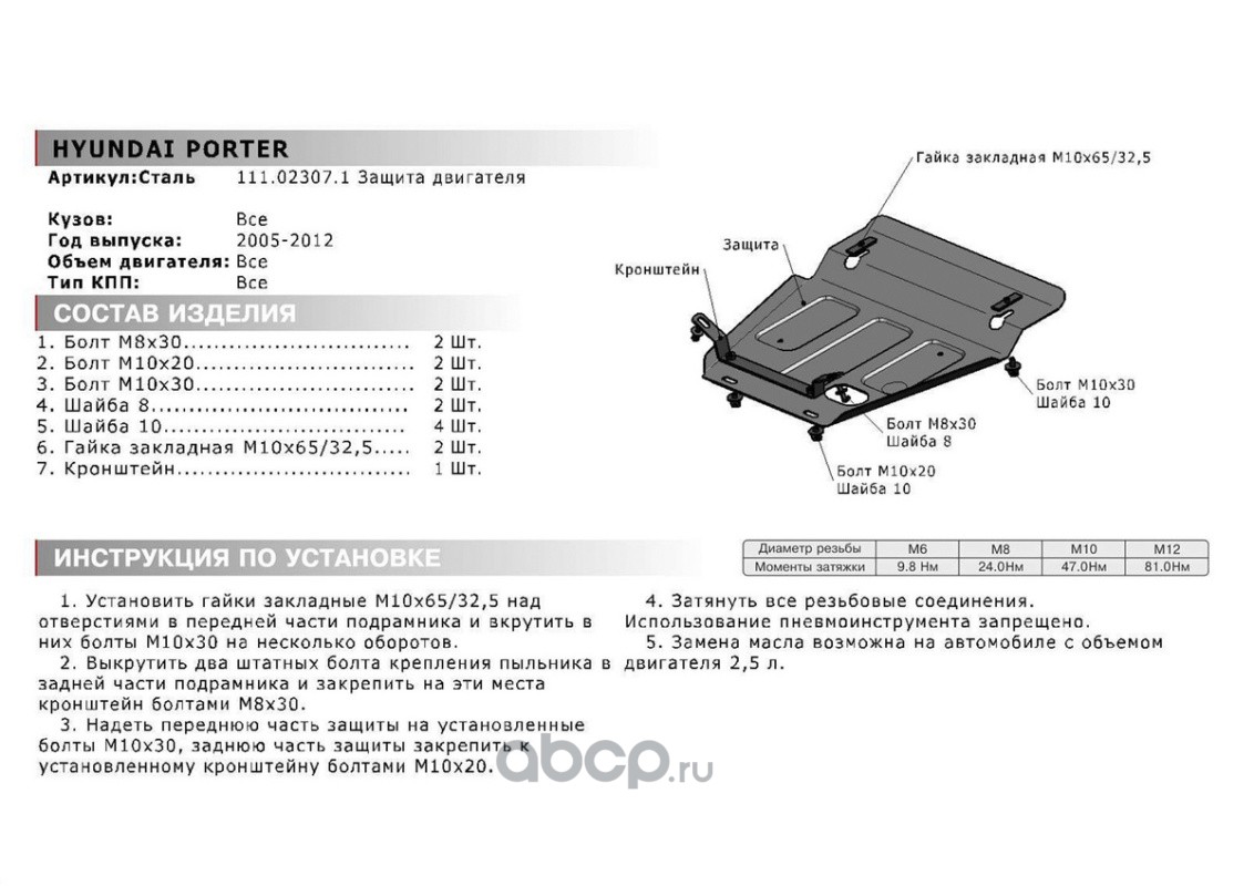 Защита картера Hyundai Porter 1998-2010, st 1.8mm