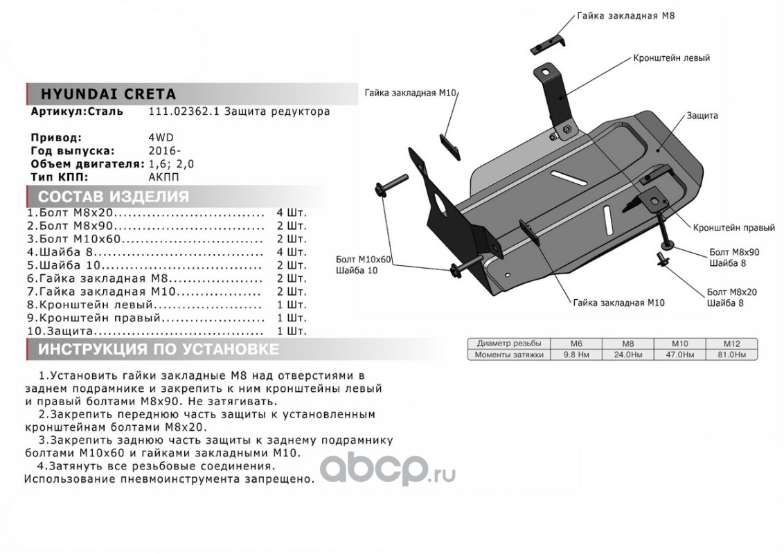 Защита редуктора Hyundai Creta крепеж в комплекте сталь 1.5 мм черный АвтоБроня