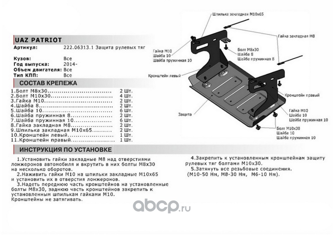 | Автоброня | 222063131 | Защита рулевых тяг УАЗ Patriot 14-16 16-, st 3mm | ||