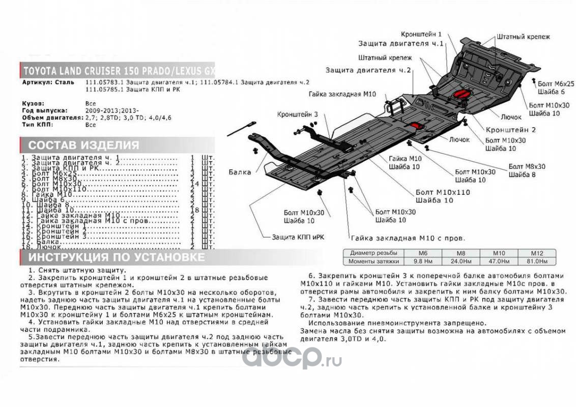 Защита картера АвтоБроня для Lexus GX (Лексус ГХ) II 460 поколение 2009-н.в./Toyota Land Cruiser Prado (Тойота) 150 IV поколение 2009-2020 2020-н.в, сталь 1.8 мм, с крепежом, штампованная, 111.05783.1