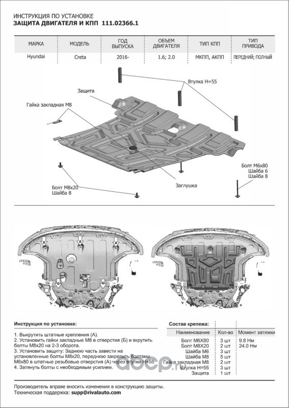 Защита картера и КПП Hyundai Creta крепеж в комплекте сталь 1.5 мм черный АвтоБроня
