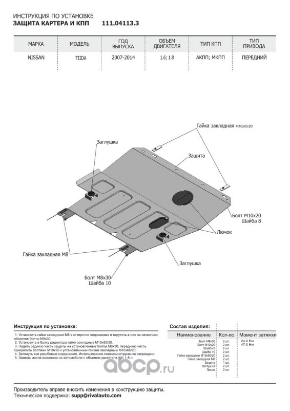 Защита картера и КПП Nissan Tiida крепеж в комплекте сталь 1.8 мм черный АвтоБроня