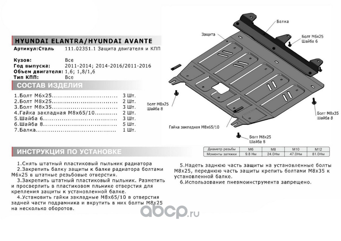 Защита картера и КПП Hyundai Avante, Elantra крепеж в комплекте сталь 1.8 мм черный АвтоБроня