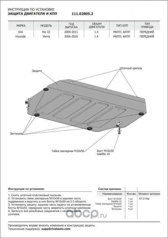 Защита картера и КПП Hyundai, Kia Verna, Rio крепеж в комплекте сталь 1.8 мм черный АвтоБроня