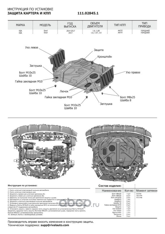 Защита картера и КПП Kia Soul крепеж в комплекте сталь 1.5 мм черный АвтоБроня