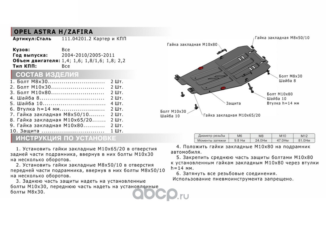 Защита картера и КПП Opel Astra, Zafira крепеж в комплекте сталь 1.5 мм черный АвтоБроня