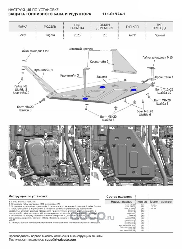 | Автоброня | 111019241 | Защ.топл.бака+редуктора Geely Tugella 20- st 1.8mm | ||