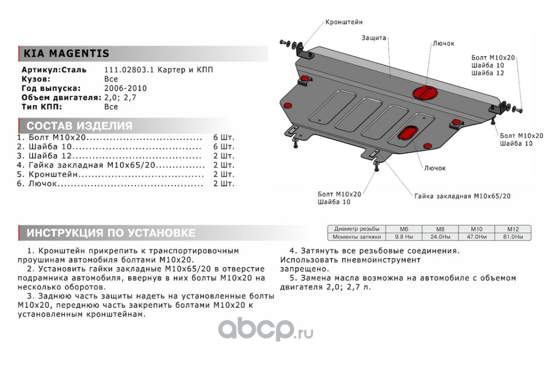 ЗК+КПП Kia Magentis II 2006-2010, st 1.8mm