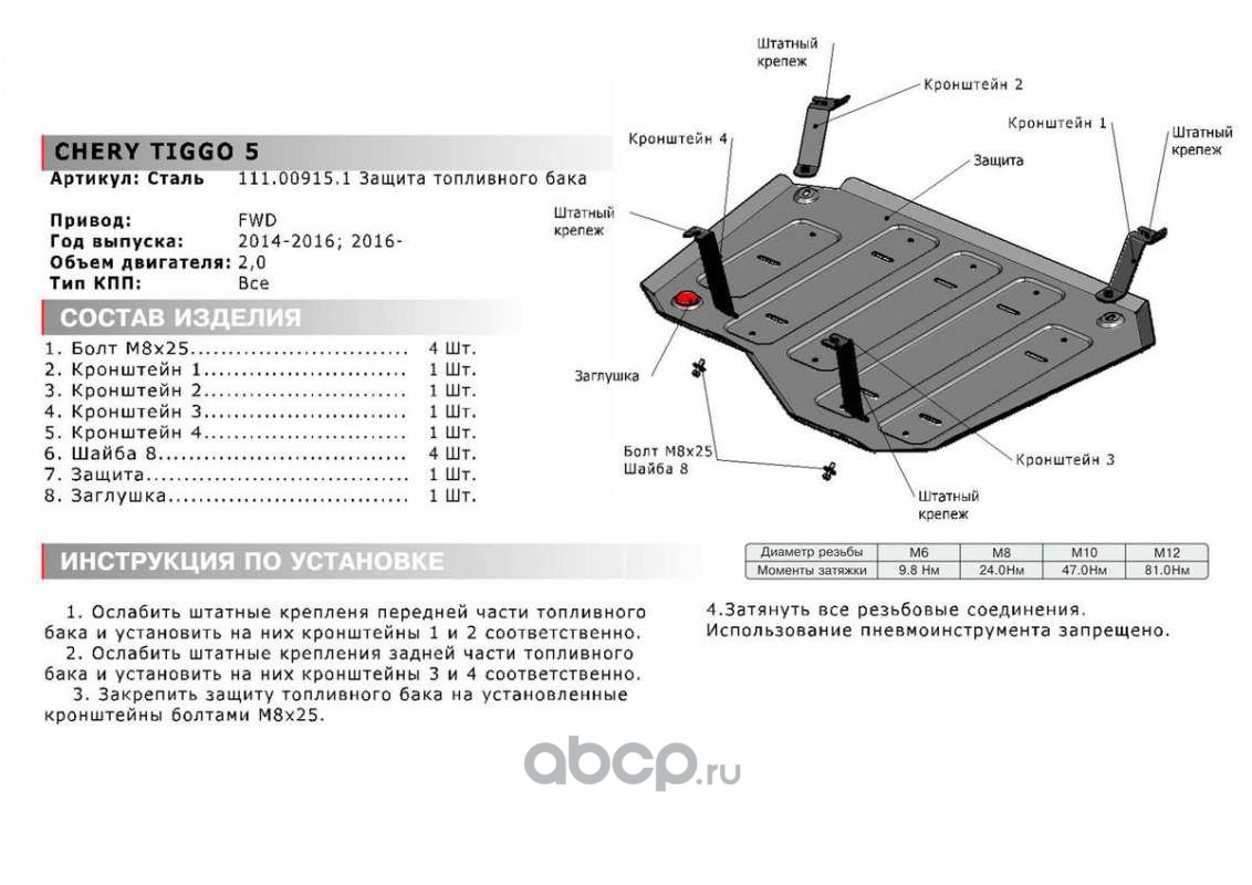 Защита топливного бака АвтоБроня для Chery Tiggo 5 (Чери Тигго 5) RWD 2014-2020, сталь 1.8 мм., с крепежом, штампованная, 111.00915.1