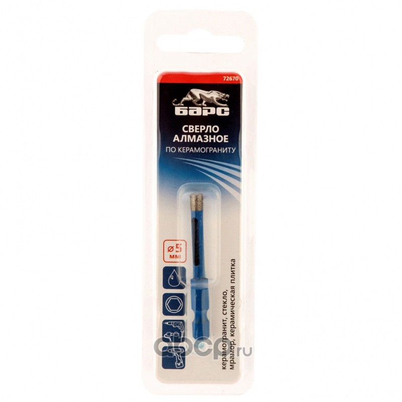 Сверло алмазное по керамограниту, 5 х 35 мм, шестигранный хвостовик Барс