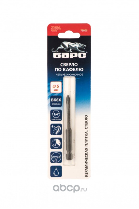 Сверло по керамической плитке 5 мм, крестовая пластинка, шестигранный хвостовик Барс
