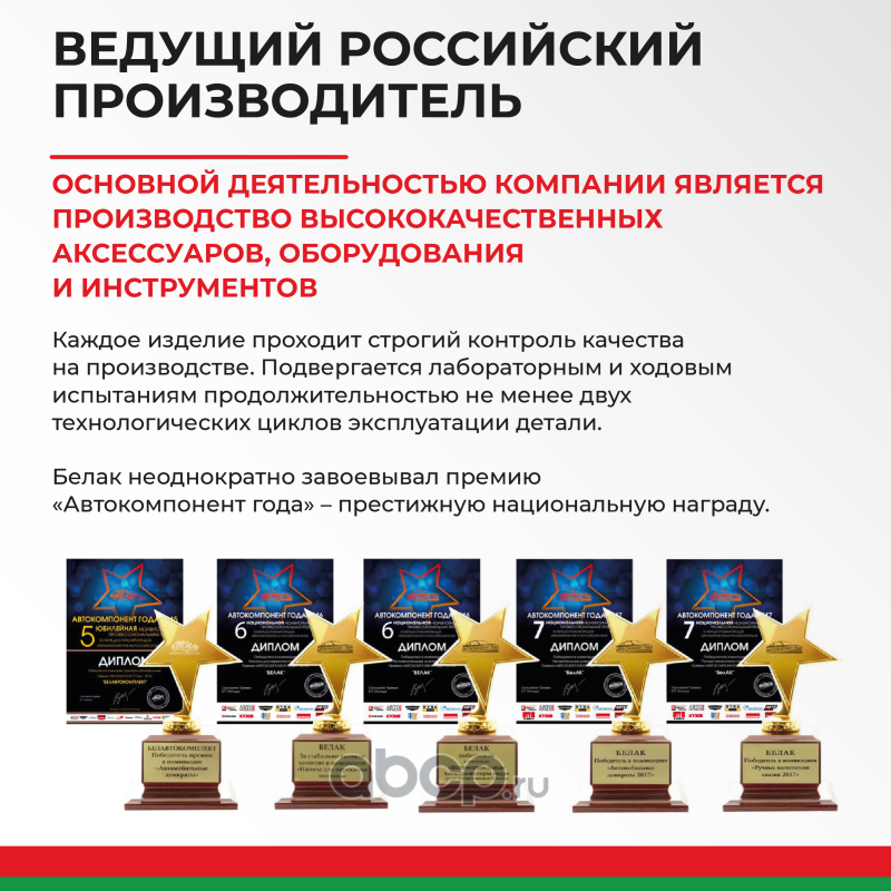 Компания «БелАвтоКомплект» - производитель автозапчастей, аксессуаров и дополнительного оборудования для автомобилей российского производства. Товары марки «БелАК» продаются в семидесяти пяти регионах и ста городах России.