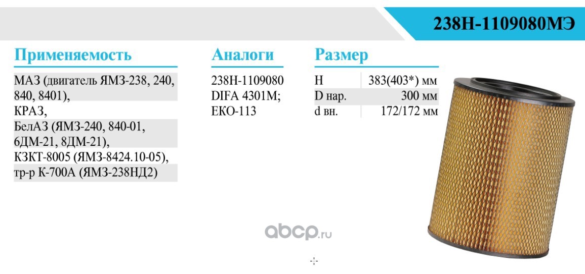 | БелТИЗ | 238Н1109080МЭ | ЭЛЕМЕНТ ФИЛЬТРУЮЩИЙ ОЧИСТКИ ВОЗДУХА | ||