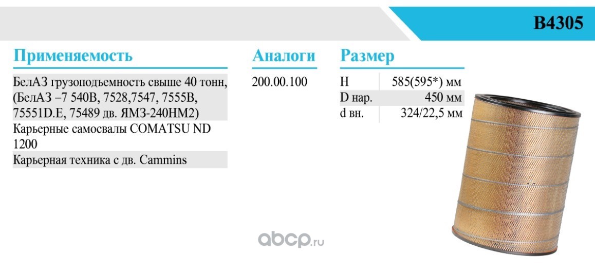 | БелТИЗ | В4305 | Фильтр воздушный | ||