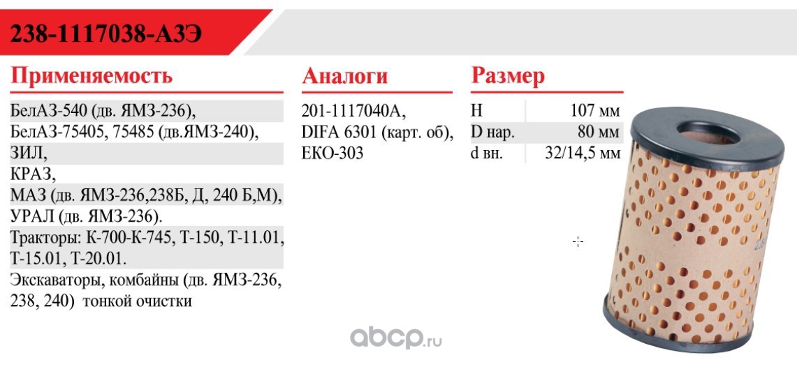 | БелТИЗ | 2381117038А3Э | Элемент фильтрующий очистки топлива | ||