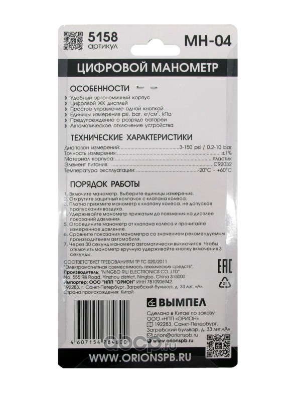 | ВЫМПЕЛ | 5158 | Манометр Вымпел МН-04 (цифровой, 10атм) | ||