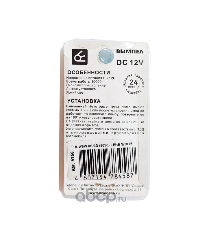 | ВЫМПЕЛ | 5156 | Светодиодная лампа W5W (T10) 6SMD (5630) LENS WHITE | ||