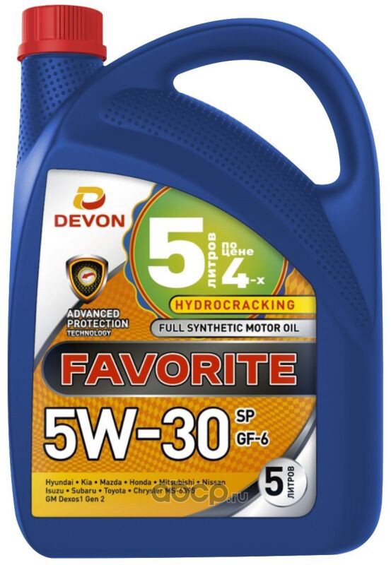 | ДЕВОН | 338663837 | Масло моторное синтетика ДЕВОН Favorite SP GF-6 5W-30 4 л. | ||