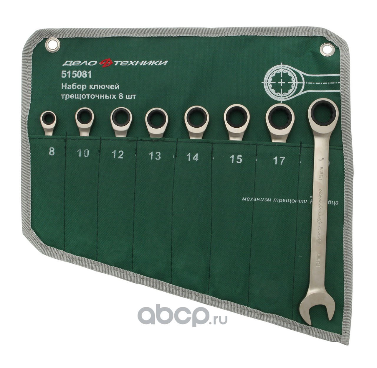 | Дело Техники | 515081 | Набор ключей комб.трещоточных (8,10,12,13,14,15,17,19 мм) 8 шт., планшет тетроновый | ||