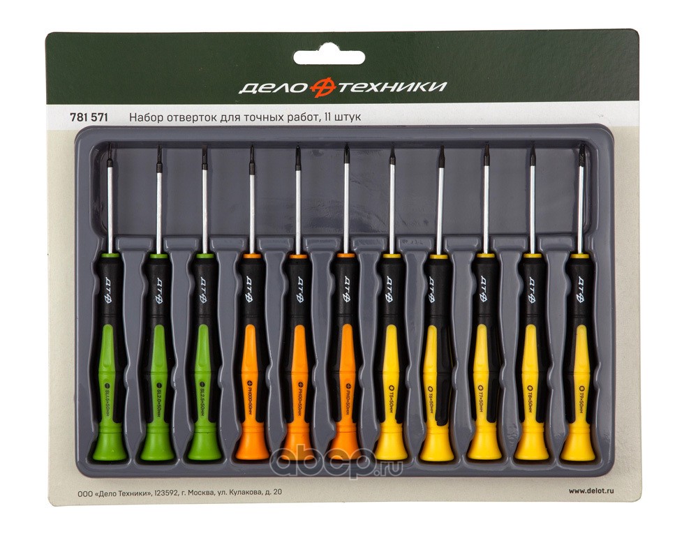 | Дело Техники | 781571 | Набор отверток для точных работ (1.5×50мм, 2.0×50мм, 2.5×50мм; PH000×50мм, PH00×50мм, PH0×50мм; T5×50мм, T6×50мм, T7×50мм, T8х50мм, T9×50мм), 11 шт. | ||