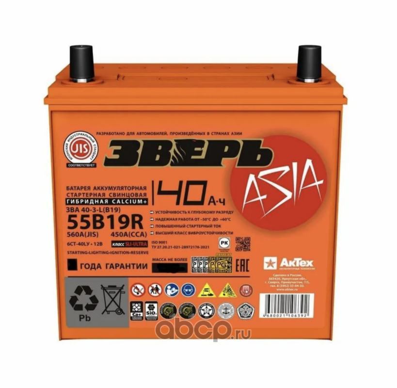 | ЗВЕРЬ | ZVKA403LB19 | Батарея аккумуляторная ЗВЕРЬ ASIA 40А/ч 450А 12V Прямая полярн. тонкие вынос. (Азия) клеммы | ||