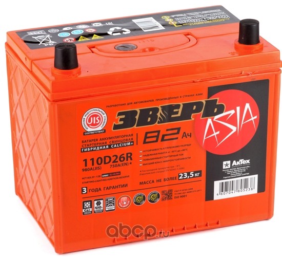 | ЗВЕРЬ | ZVA82ЗL | Батарея аккумуляторная 82А/ч 750А прямая полярн. выносные (Азия) клеммы | ||