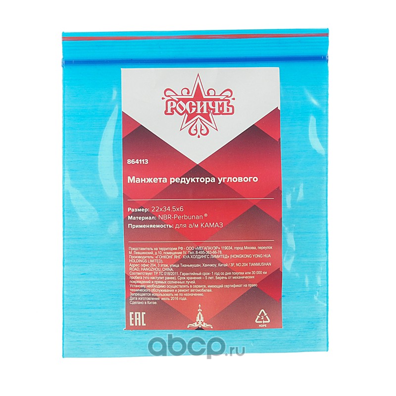 | РОСИЧЪ | 864113 | Сальник КАМАЗ редуктора углового 22х34.5х6 РОСИЧЪ | ||