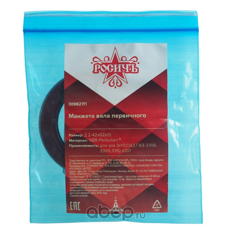 | РОСИЧЪ | 309827П | Сальник ЗИЛ,ПАЗ,ГАЗ-3306,3309,3310,4301 вала первичного КПП 2.2-42х62х10 РОСИЧЪ | ||