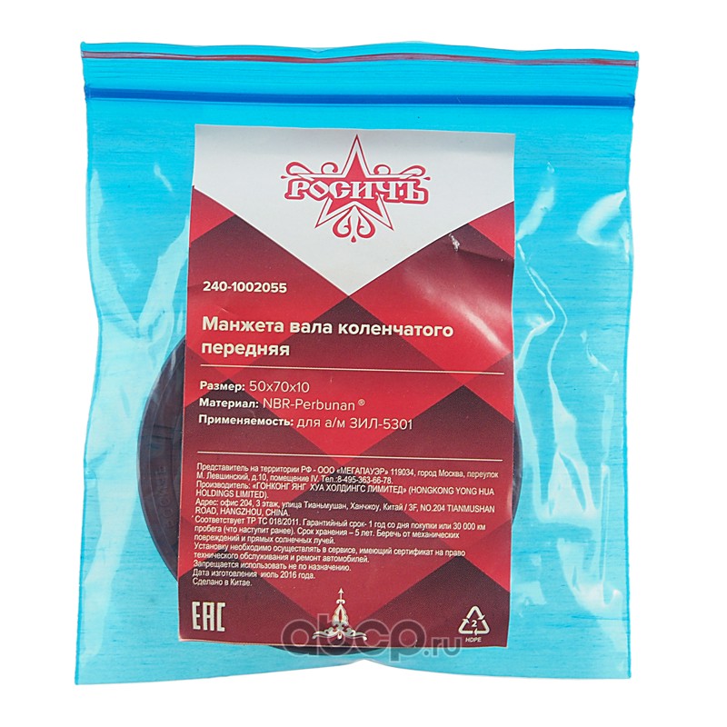 | РОСИЧЪ | 2401002055 | Сальник коленвала ЗИЛ-5301 передний 50х70х10 РОСИЧЪ | ||