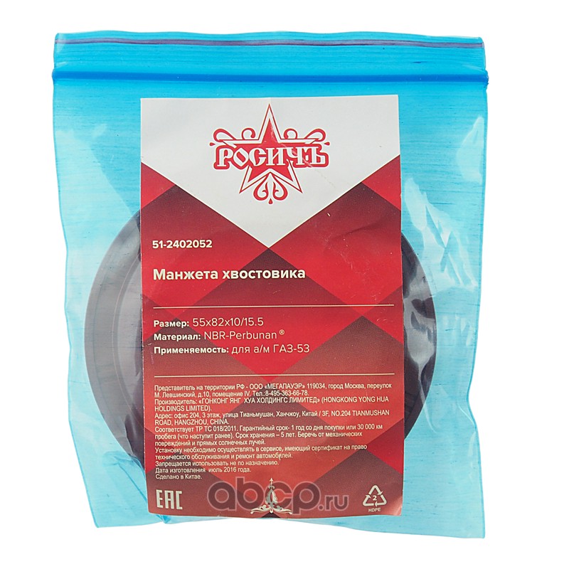 | РОСИЧЪ | 512402052 | Сальник ГАЗ-53,3307,ГАЗон Next хвостовика 55х82х10/15.5 РОСИЧЪ | ||