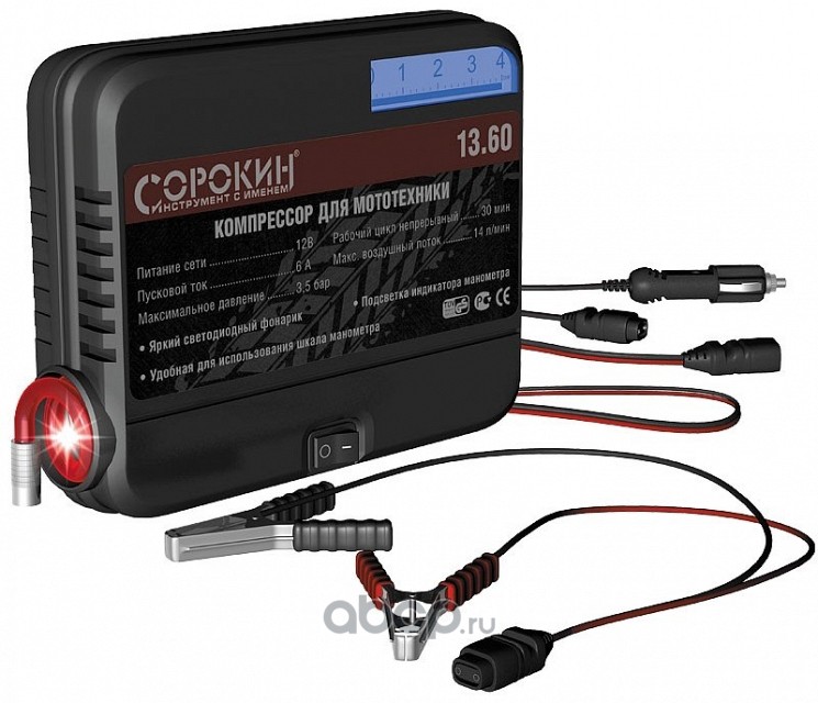 | СОРОКИН | 1360 | Компрессор для мототехники 12В, 3,5бар, встроенный светодиодный фонарь | ||