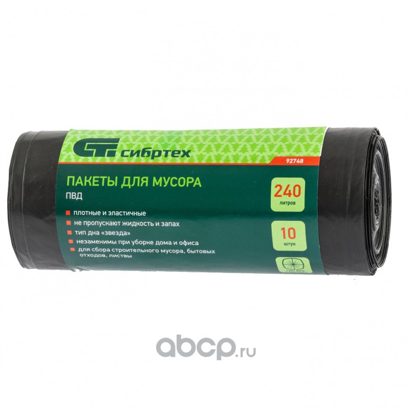 Пакеты для мусора 240 л x 10 шт, пвд, короткий ролик, тип дна "Звезда",Россия Сибртех