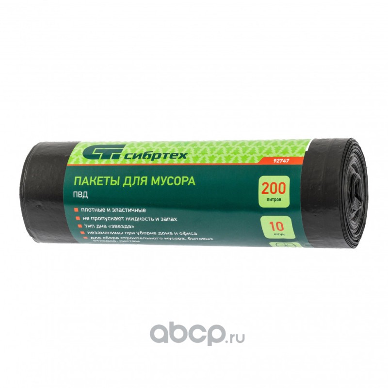 Пакеты для мусора 200 л x 10 шт, пвд, короткий ролик, тип дна "Звезда",Россия Сибртех