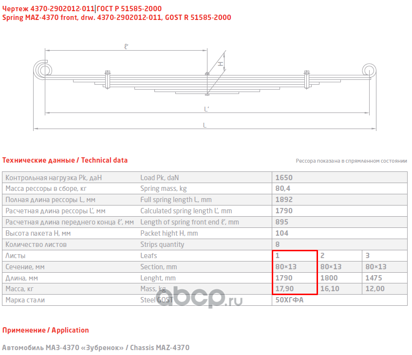 ЧУСОВСКАЯ РЕССОРА 690004863 Лист №1 Рессора передняя для МАЗ 4370 8 листов