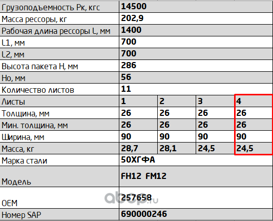 ЧУСОВСКАЯ РЕССОРА 690011106 Лист №2 Рессора передняя для Mercedes Actros 1823-1851, Actros 3331-3340, Actros 2031-2055 3 листа